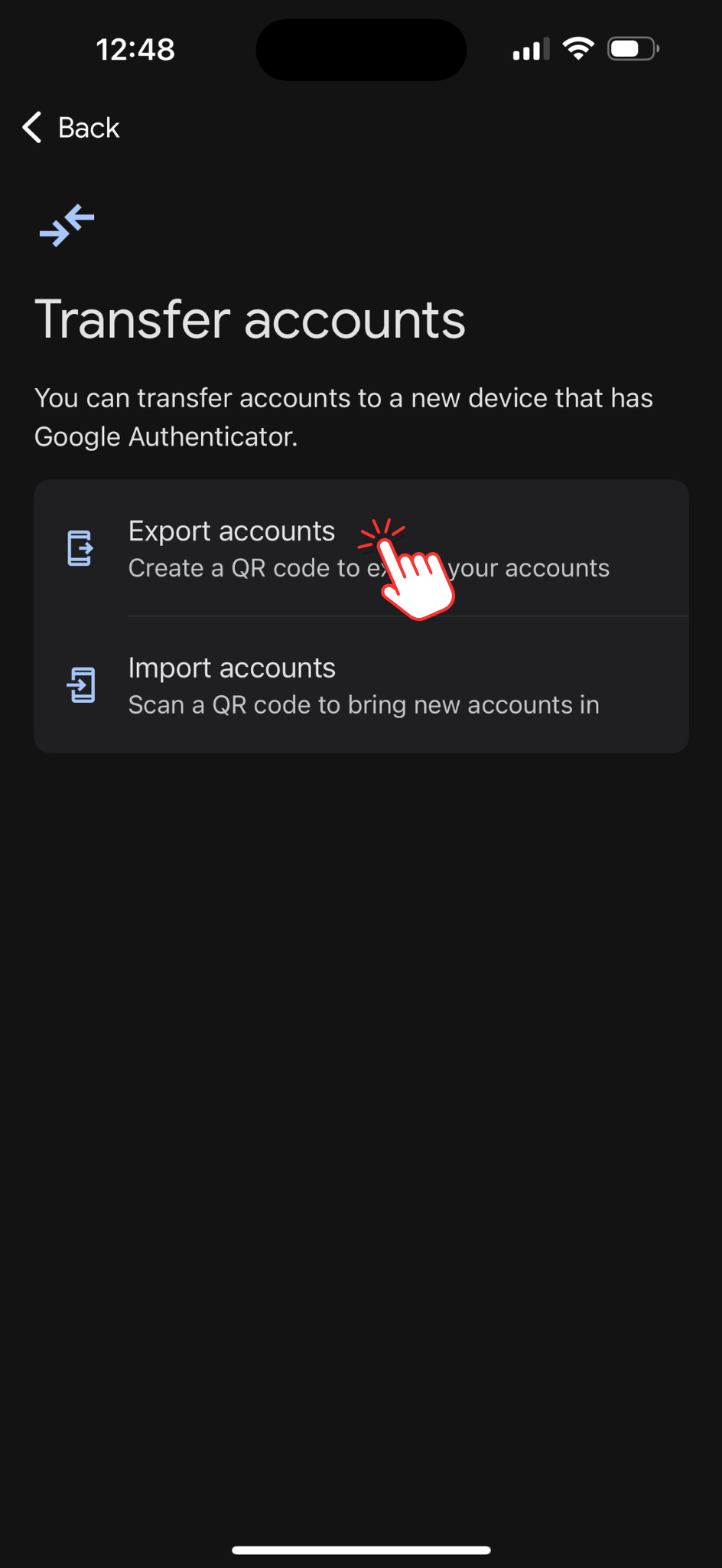 4. Tap Export accounts, then enter your phone’s PIN code or use your fingerprint to continue.