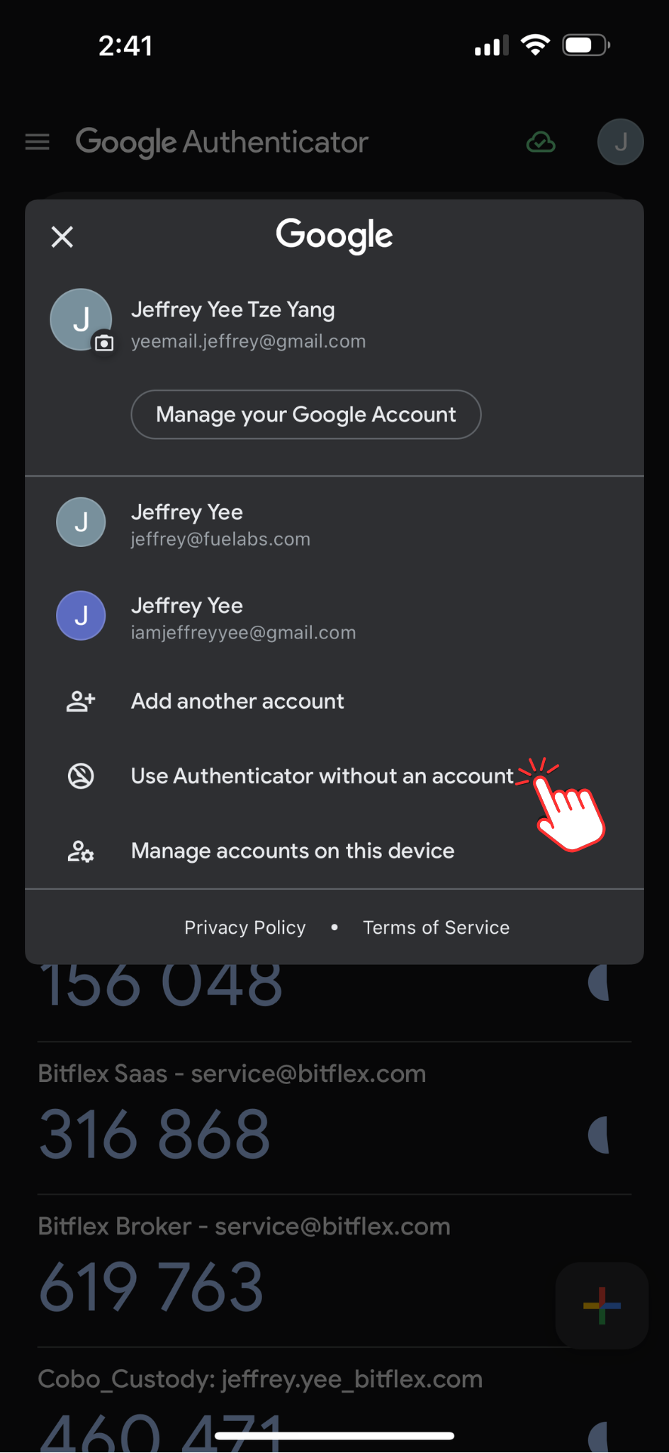 3. Select Use Authenticator without an account from the menu.